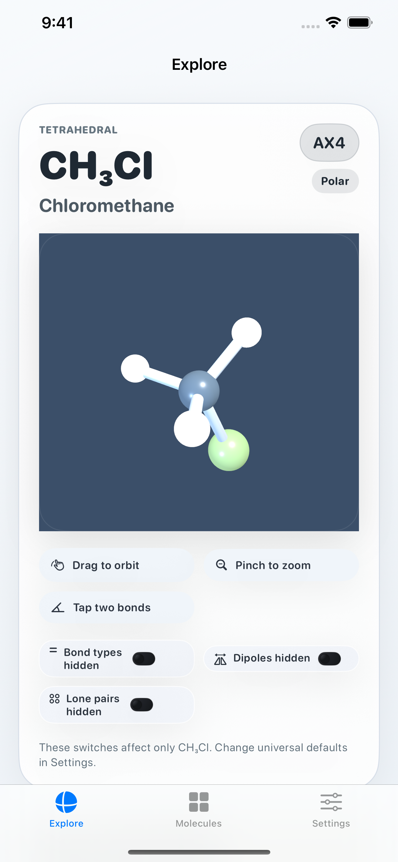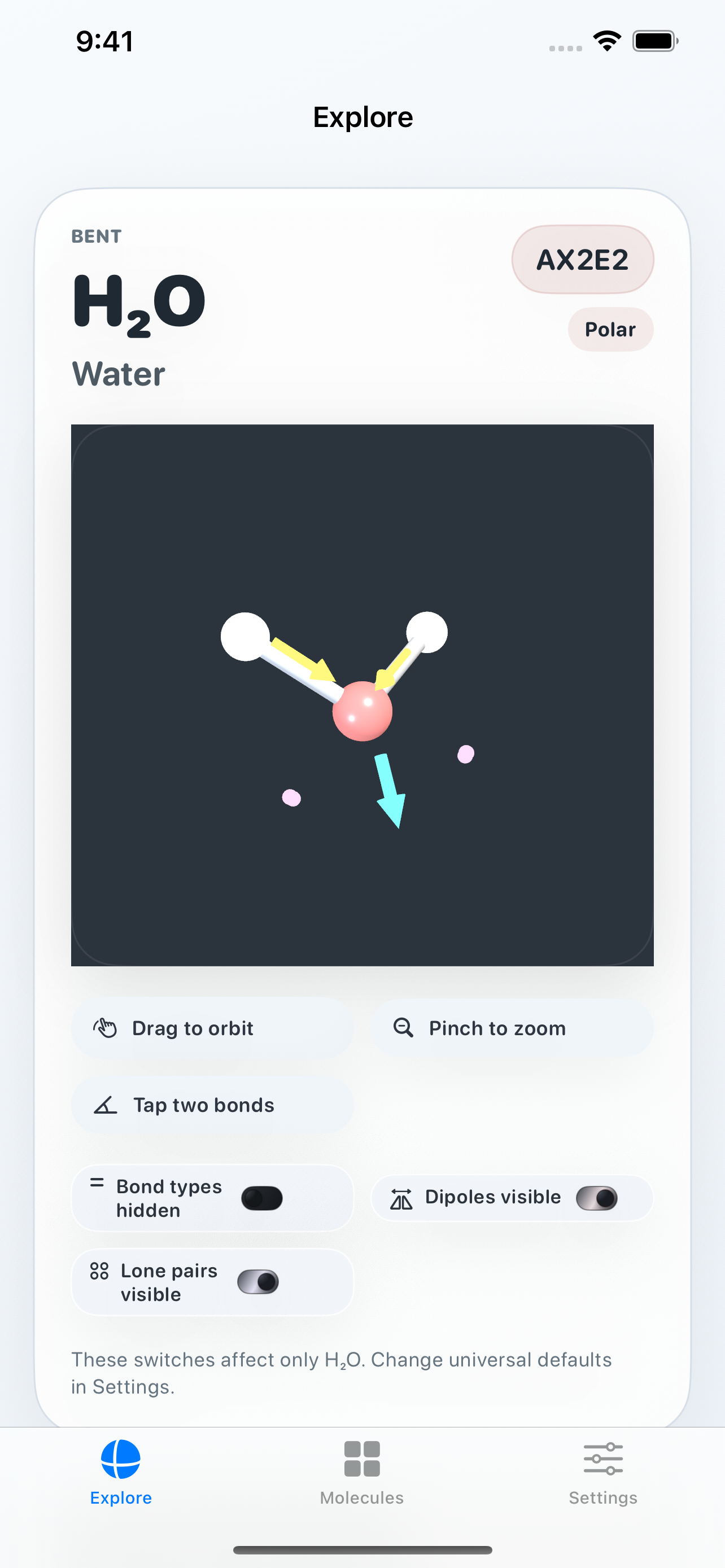 Switch on polarity overlays and lone pairs to make electron-domain effects visible instead of leaving them as abstract textbook notes.