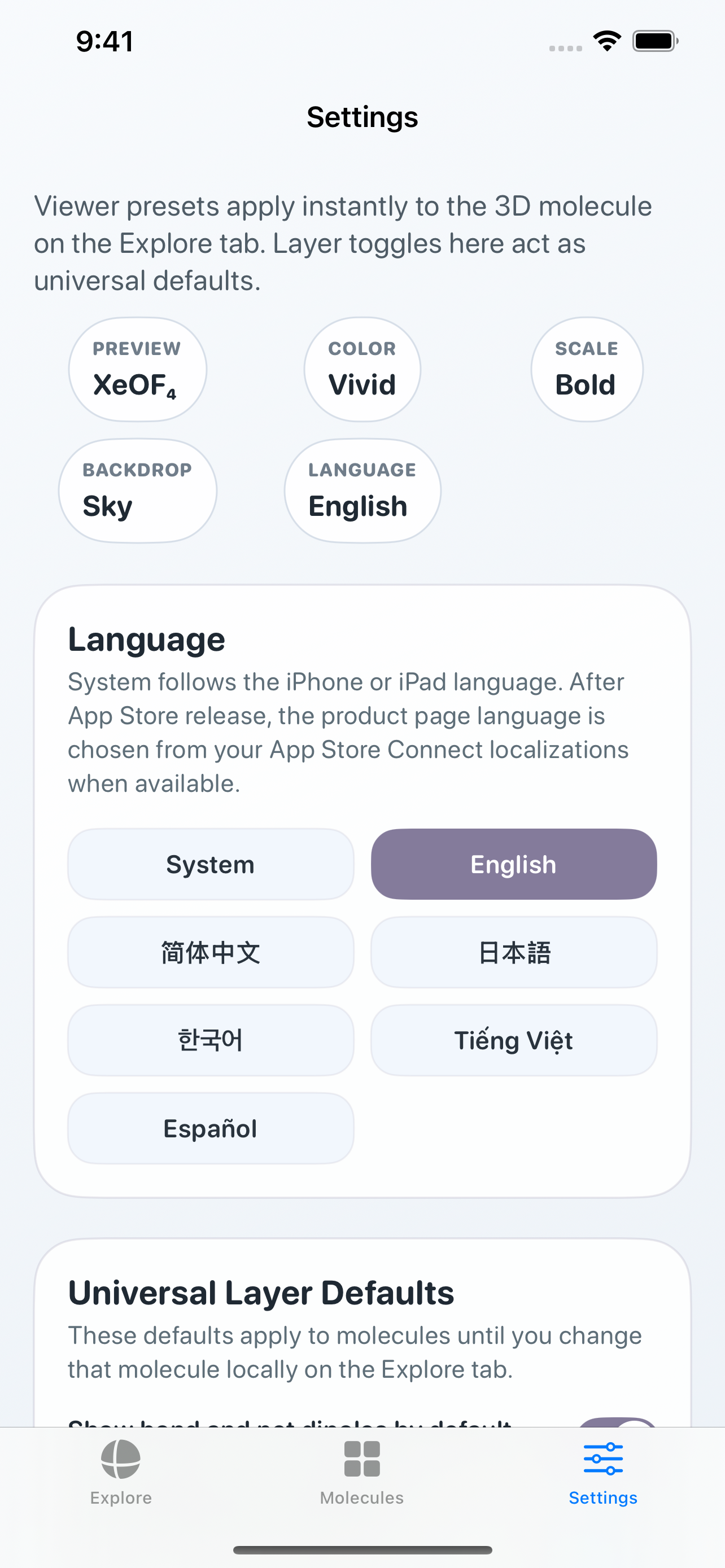 The settings screen lets learners change language, backdrop, scale, and color style without leaving the app's chemistry workflow.